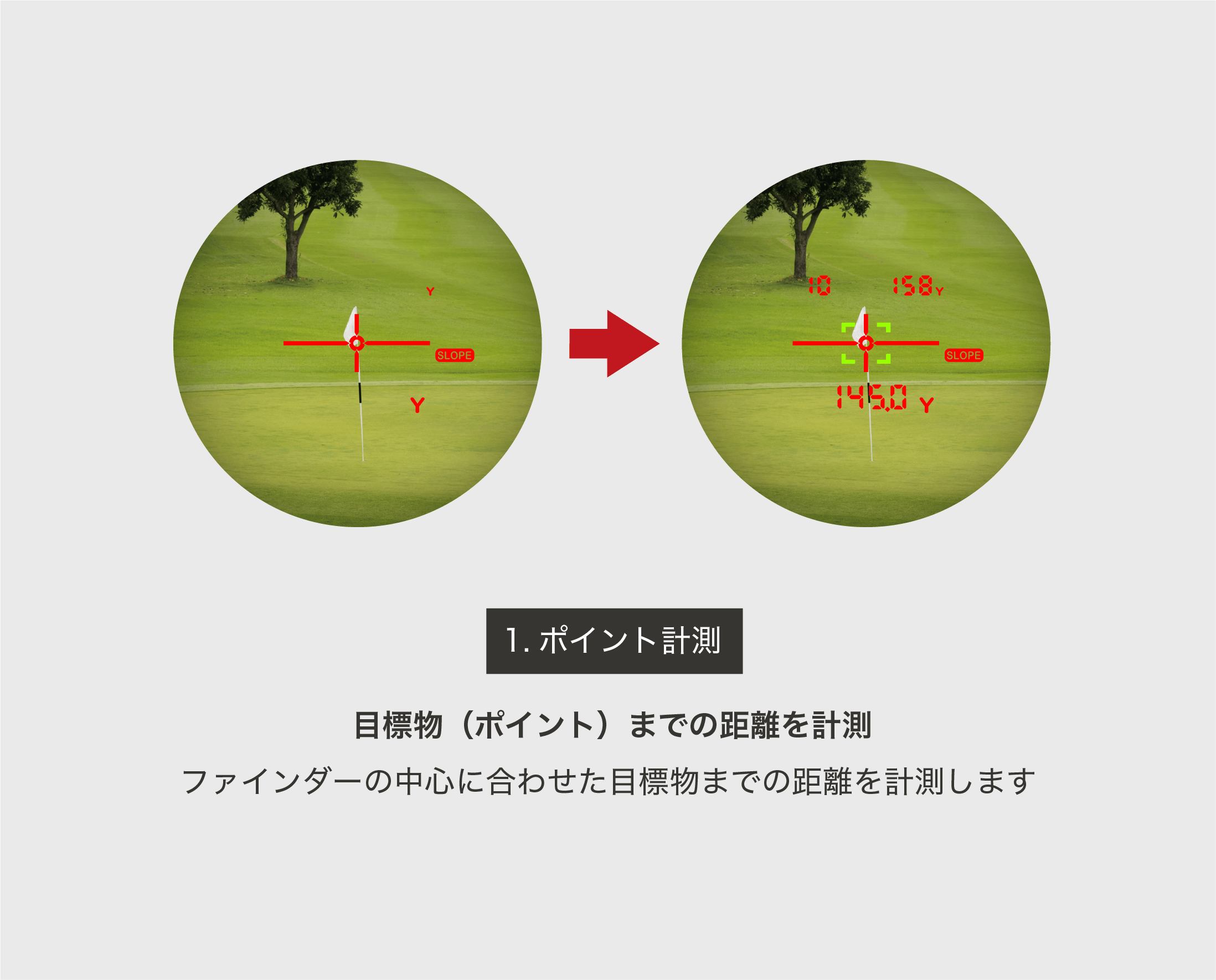 まずピンの奥にある対象物(木など)を計測します。暫定の距離が表示されたら、ピンフラッグが照準の中心になるようにゆっくり動かします