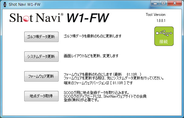 デスクトップにある「Shot Navi W1-FW PC Tool(腕時計のアイコン)」か、スタートメニューのプログラム→ShotNavi→W1-FW から、ツールを起動できます。